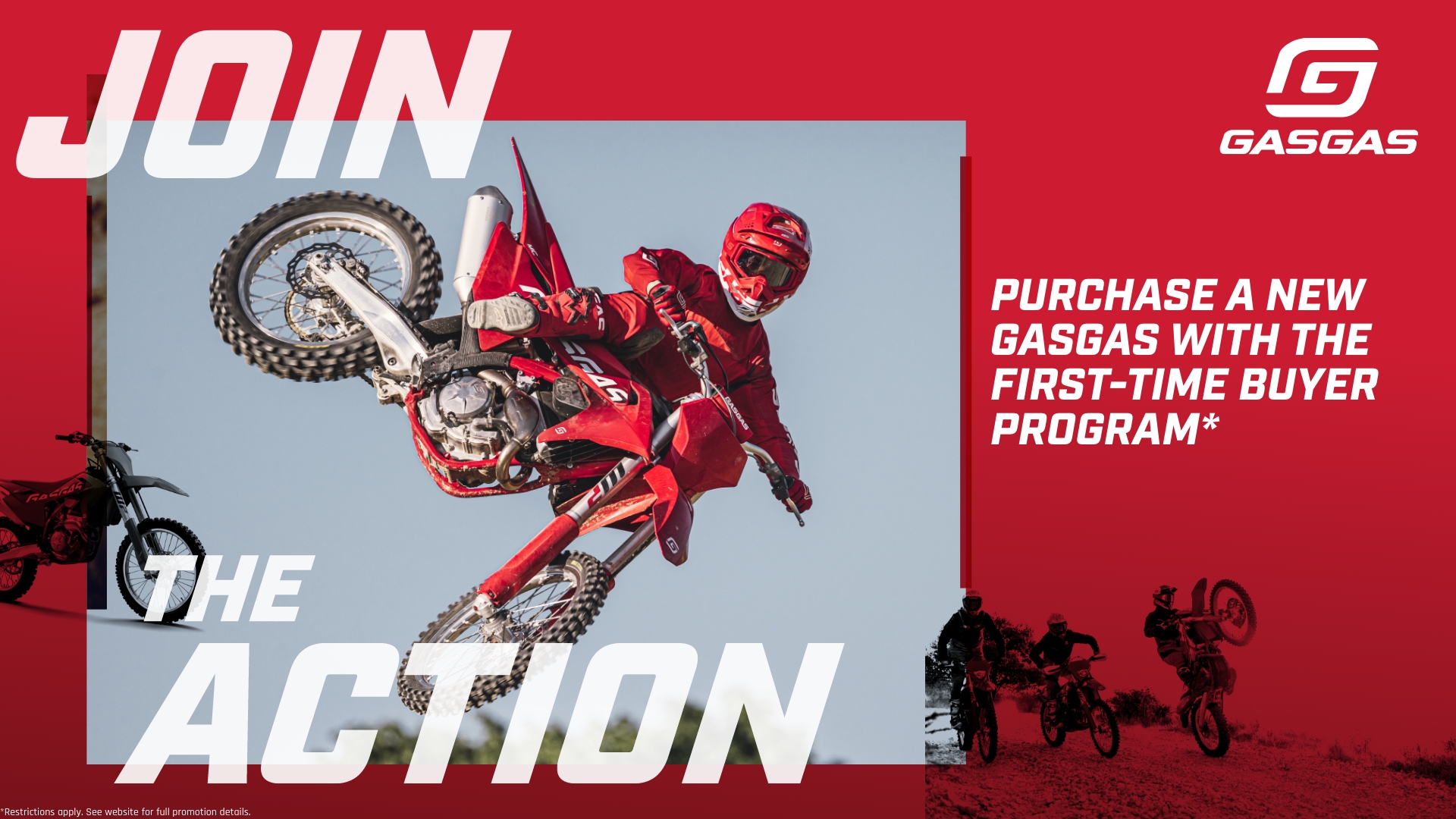 *Terms and Conditions: : Offer applies to new, untitled and unregistered 2024 GASGAS TXT RACING (250 / 300), TRAILS GP (250 / 300), MC-E (3 / 5), MC (50 / 65 / 85 (17/14 & 19/16) / 125 / 250 / 250F / 350F / 450F / 450F Factory Edition), EX (250 / 300 / 250F / 350F / 450F), EC (250), ES (350 / 500 / 700) and SM 700 model motorcycles. Financing offer available through Santander Consumer Bank “Santander”. Where no money down is indicated, it is available only to those well-qualified applicants with approved credit. Annual Percentage Rates (APR) of 0.99% for up to 60 months, and no down payment offers available to qualified applicants only. Santander requires a minimum financing amount of $1,500. Not all buyers will qualify and if approved may receive a higher rate and higher payment, depending on credit score. Some buyers will require a higher down payment in order to receive credit approval. Other charges may apply. Subject to model availability and dealer participation. Subject to credit approval by Santander, not all applicants will qualify. Santander maintains the right to charge back all costs of financing should a retail promotion and a financing offer be selected when the 2 cannot be combined (as defined in the retail program). Financing offer can change or be cancelled at any time. Offer valid January 1, 2026, through March 31, 2026. This offer cannot be combined with any other offers. Finance offer valid through authorized GASGAS dealers only. See local authorized dealer for details.